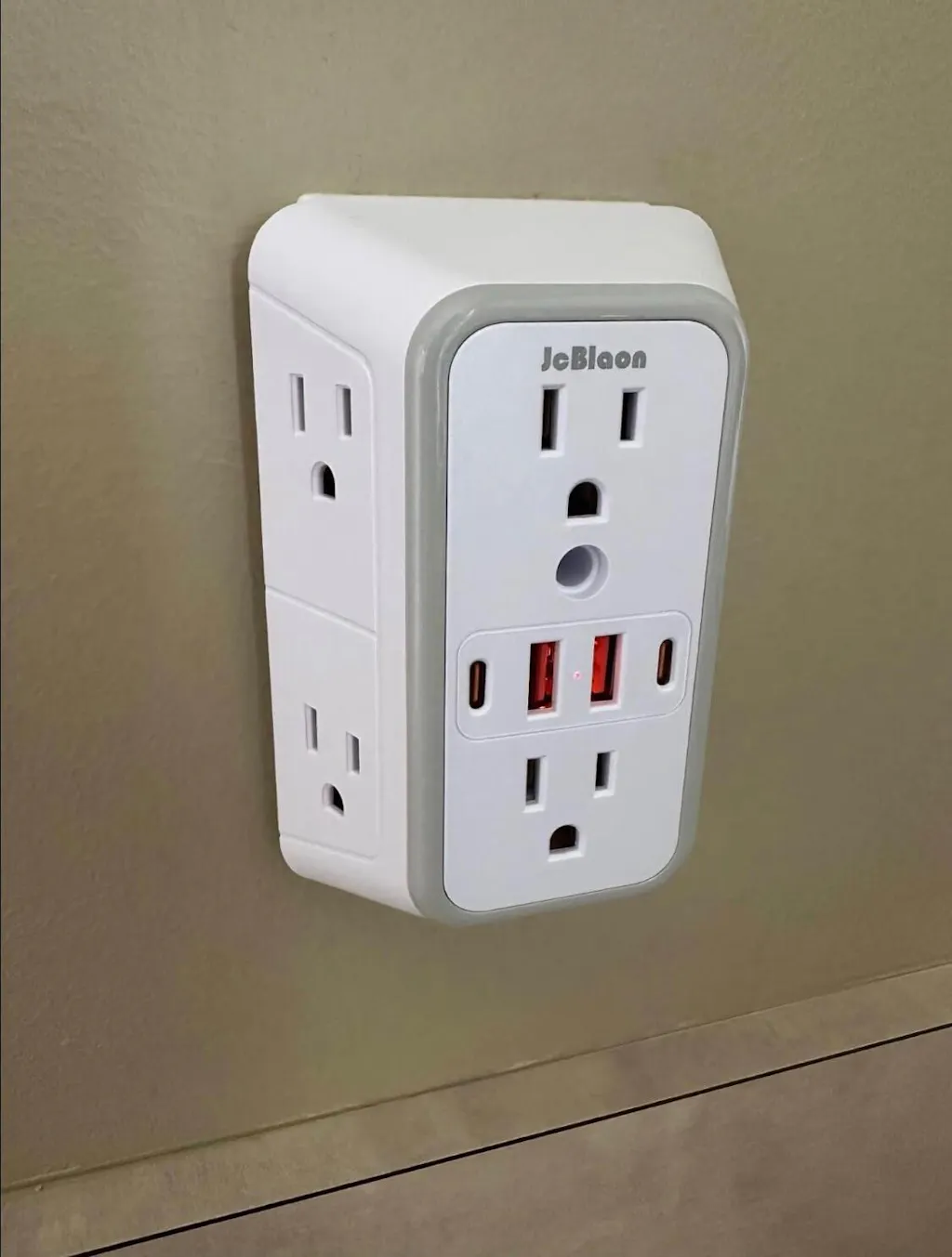 Extensor de enchufe con 6 tomas AC, 2 puertos USB-A y 2 USB-C, ideal para conectar hasta 10 dispositivos al mismo tiempo. Se instala fácilmente en el enchufe de pared y el orificio para tornillo permite fijarlo de forma segura.